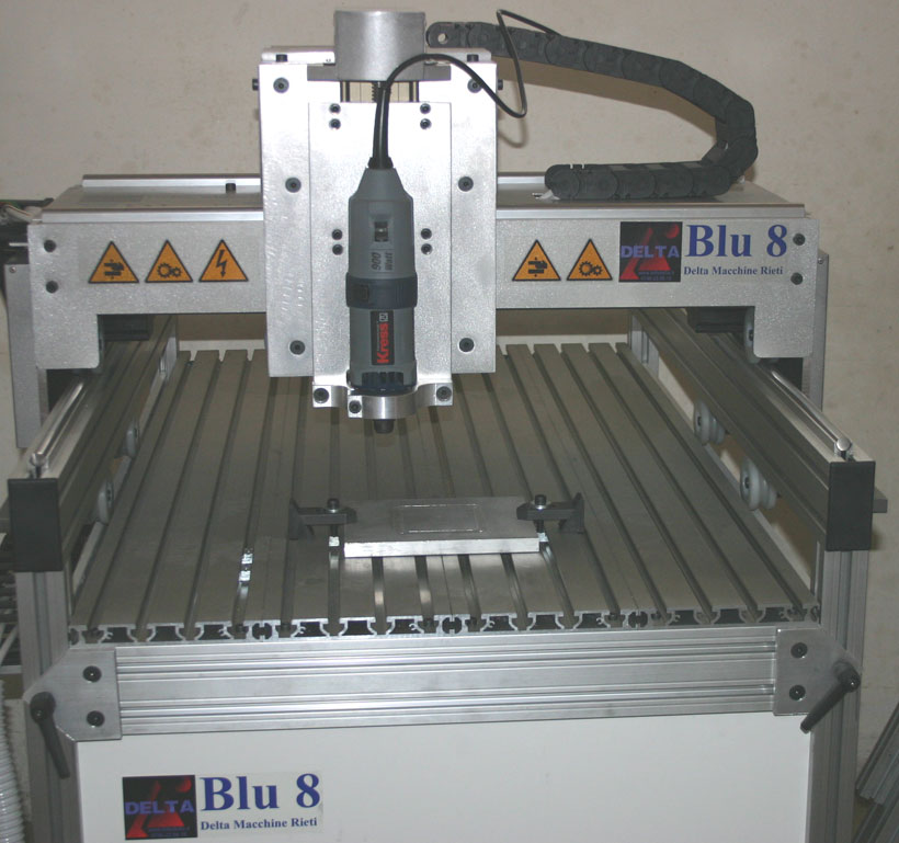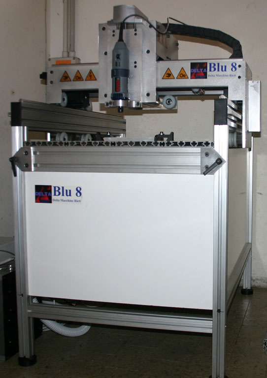 La gamma Blu8 e’ stata ampliata con i seguenti modelli: Blu8 Giotto: stesso ingombro del modello standard, ma con guide a ricircolo di sfere sui 3 assi e cinta a gioco ridotto. Area di lavoro 650x450mm a causa di maggiore inguidamento delle piastre, supportando carichi di lavoro maggiori rispetto alla versione standard. Macchina veloce, robusta e molto precisa. Il box controllo motori alloggia 4 schede HD5056 microstepping.Prezzo : a partire da 6600 euro Il prezzo non include:iva,trasporto,formazione ed eventuali optionals. NB: la versioneGiotto con motore HF e' in grado di lavorare sia materiali plastici che materiali metallici quali alluminio, rame, ottone ecc. Da Gennaio 2008 il modello Blu8 Giotto può montare vite a ricircolo su asse Z, per l'utilizzo della macchina in incisoria.